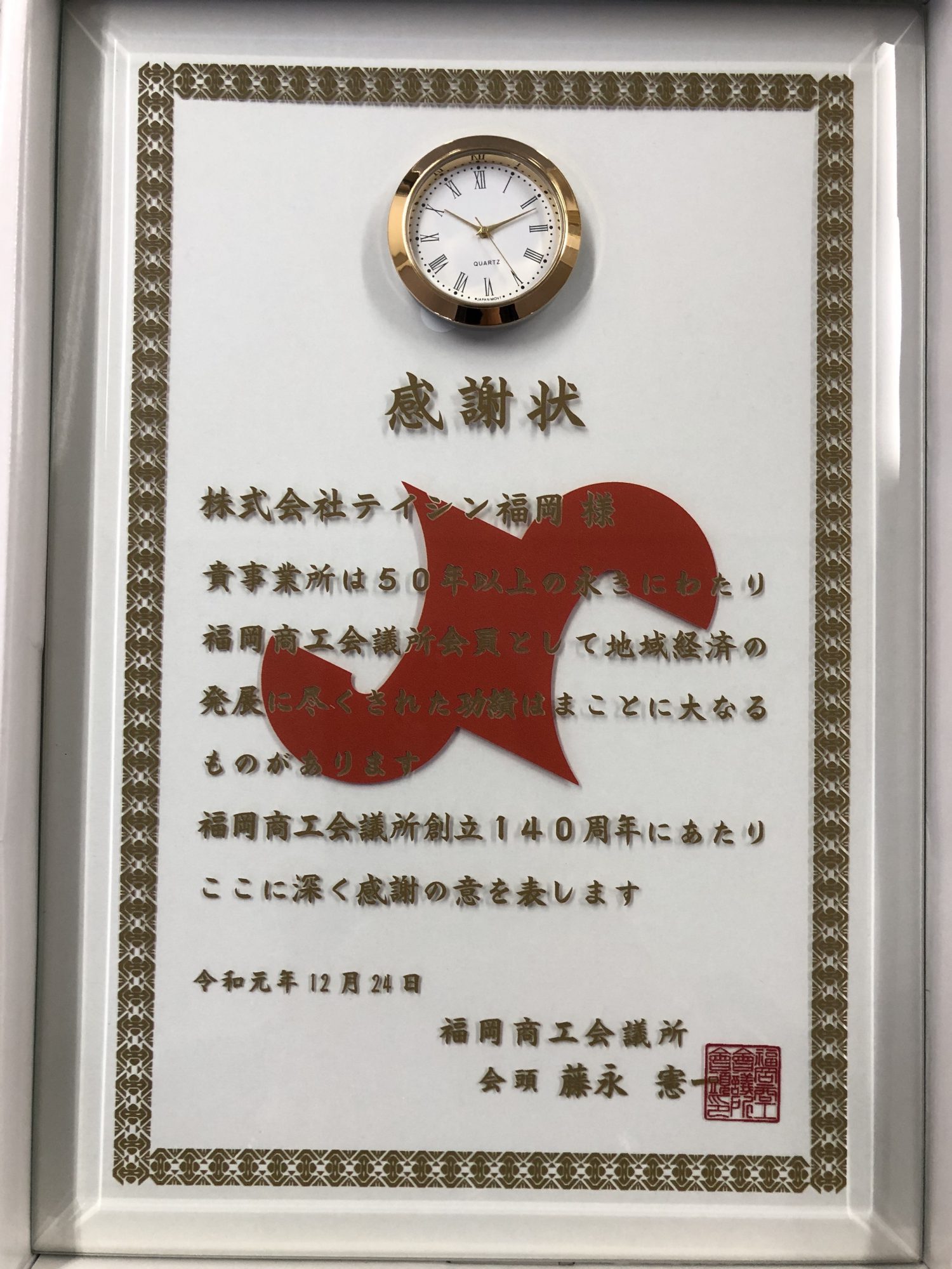 本日、令和元年12月24日、「福岡商工会議所」様の創立140周年事業の