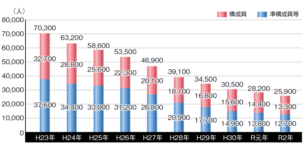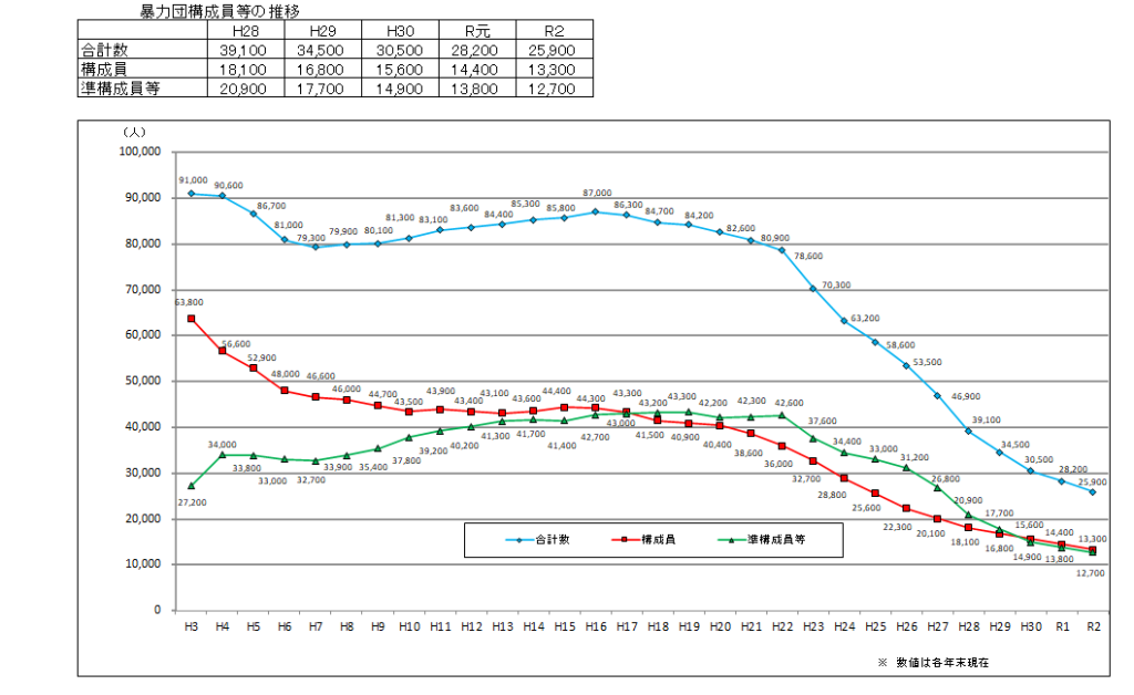 同法施行前には 警察庁が発表している 全国に約 9 万人いたとされる暴力団員(準構成員を含む) の人数は、 2020年(令和2年)においては約2万5900人まで激減しているほか、純粋な構成員では 1 万 3300人ほどになっているとされています。