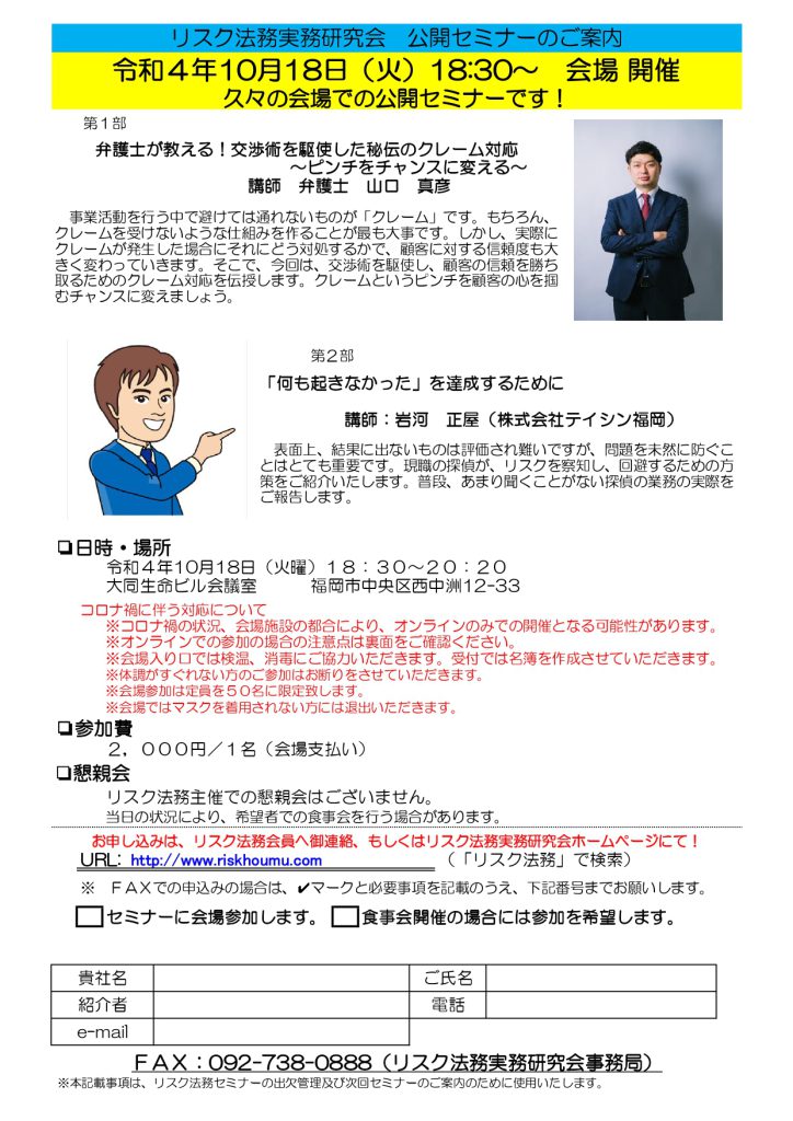 本年も「リスク法務実務研究会」様で弊社代表、岩河が調査業及び探偵業についてお話させていただく機会を賜りました。